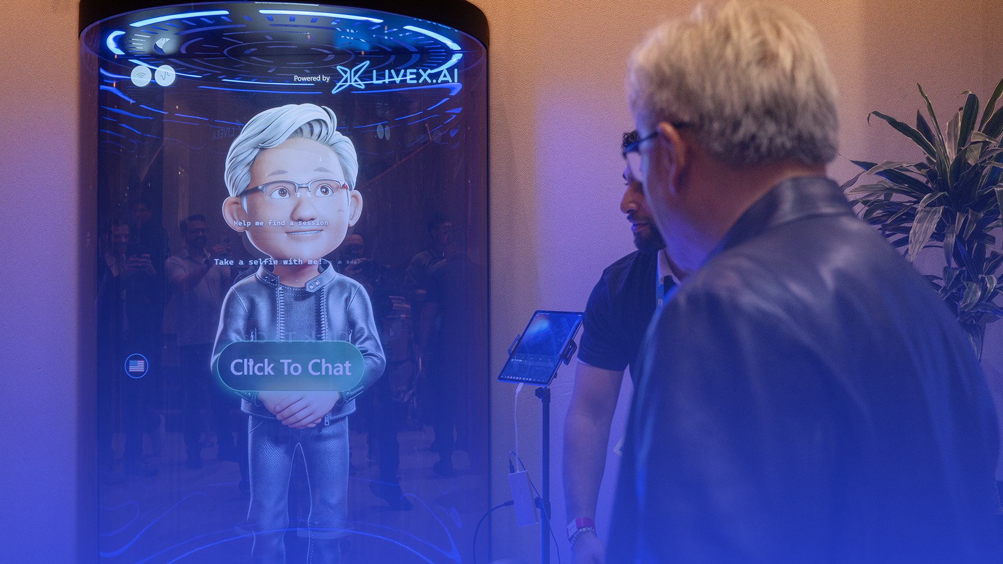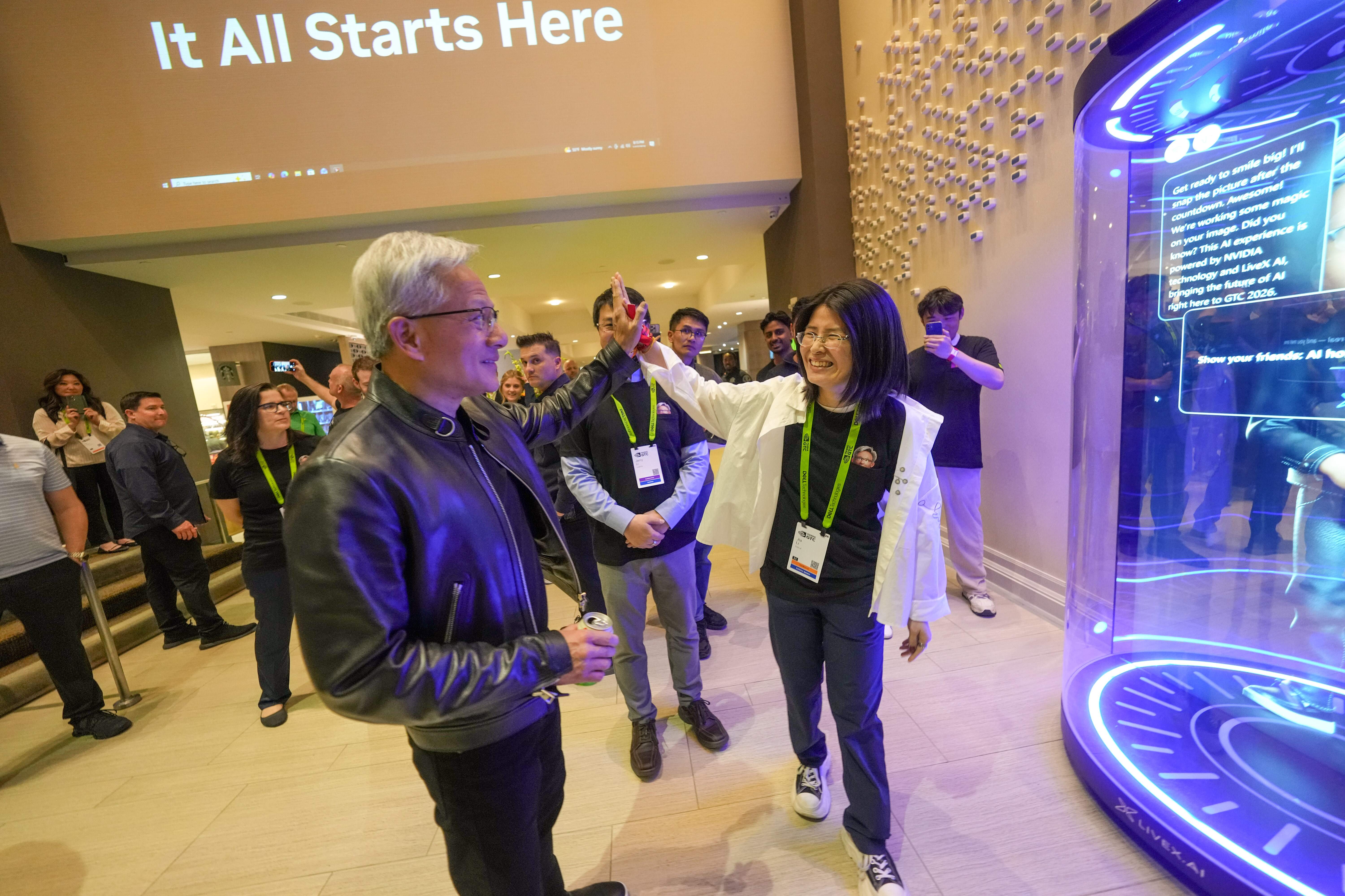 Among the highlights: Toy Jensen, or TJ. The holographic AI agent, named after NVIDIA’s CEO, became a fixture across the show floor. Eighteen avatars stood inside transparent vessels, answering attendee questions about the conference, physical AI, accelerated computing, and AI agents. TJ also became a viral moment on the floor, posing for photos—including one with Huang himself alongside his holographic counterpart.